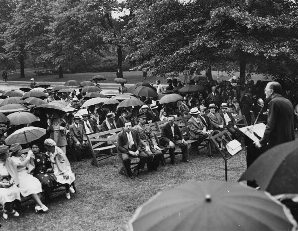 Dedication Ceremony, 1937 A crowd gathers at the Hebrew Cultural Garden for the dedication of the "Musician's Garden." This fixture was built in the shape of a lyre and featured plaques honoring several Jewish musicians. Image courtesy of Cleveland State Library Special Collections