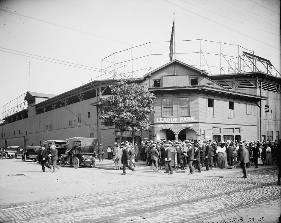 The construction of the massive, 70,000-seat Cleveland Municipal Stadium in the 1930s spelled the beginning of the end for a much older stadium— League Park. This ballpark was constructed in 1891 east of downtown in Cleveland's Hough neighborhood at Dunham Street (East 66th) between Linwood and Lexington Avenues. Lexington Avenue trolley-line operator Frank Robison shoehorned the ballpark into the residential neighborhood, conveniently generating revenues from fares and game tickets. Its tight quarters and restrictive right-field fence to fit the property gave rise to “pinball” baseball, leaving outfielders never knowing where the ball would ricochet. Close-by homes featured signs advertising local businesses for home-run promotions. Despite renovations in 1910 that replaced the original wood with concrete and steel, expanding capacity to over 20,000, League Park was deemed to be too small and antiquated for professional baseball after Municipal Stadium opened.