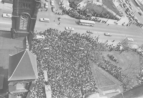 Martin Luther King Jr. Memorial Service, 1968 Invested with the meanings inscribed into Cleveland's most symbolic public space, Old Stone Church has been a place for residents of the city to gather in times of celebration and mourning. The congregation of First Presbyterian Church embraced this shared history with the Public Square and have regularly opened their church doors to Clevelanders for private and public worship. Providing a space for ceremony and ecumenical services at the heart of the city, the church has been the site of countless weddings as well as public memorial services for Abraham Lincoln, John F. Kennedy, Martin Luther King Jr., and World Trade Center victims. Photograph courtesy of Cleveland State University Special Collections