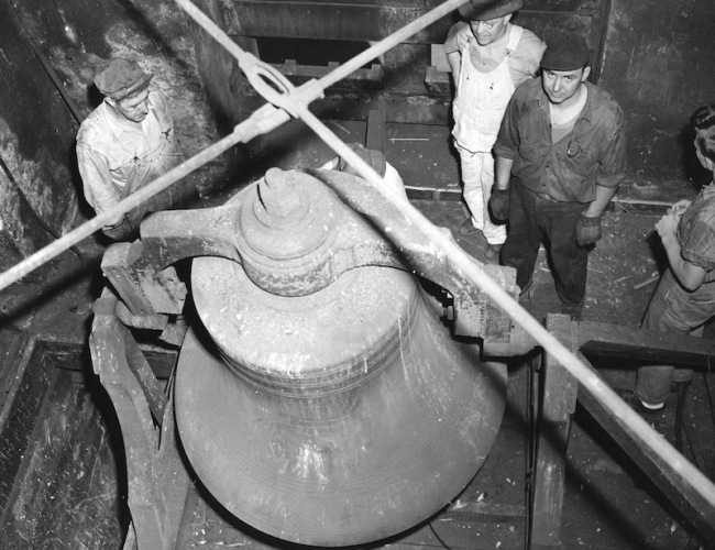 Old Stone Church Bell In 1865 Cleveland celebrated the end of the Civil War but mourned the loss of their President and the friends who had died away from home. Ceremonies were given in that year that recognized these conflicting emotions: President Abraham Lincoln's funeral procession through public square and a Thanksgiving service celebrating the war's end. During both ceremonies, however, one thing remained the same - the ringing of the First Presbyterian Bell. The bell was cast and presented to the First Presbyterian belfry in 1865. It remained there for over a century until 1982 when it was removed. In 1989 the bell was returned to the church but did not make it to the belfry. It was instead placed in front of the church as a reminder of the "Year of Peace" in which it was cast. Image courtesy of Cleveland Public Library Photograph Collection