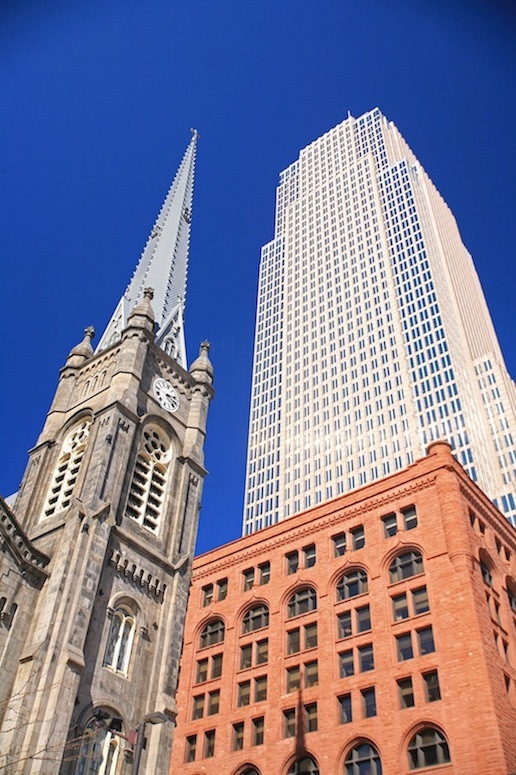 To a large degree, Old Stone Church's popularity as a local landmark was due to its location on the Public Square. The building provided the backdrop for citizen meetings, picnics, protests, military processions, public celebrations, and leisurely walks in Cleveland's most famous and important public space. Even as the landscape surrounding Cleveland's Public Square became unrecognizable to each passing generation, the church retained its present location. With its steeples extending upward from the heart of Cleveland, the history and memories surrounding Old Stone Church have become intertwined with the city's identity.