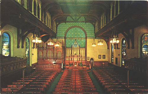 Old Stone Church, Interior The interior of Old Stone Church was destroyed by fire two times since its dedication in 1855. The first fire, occurring less than two years following the church's completion, was attributed to an ill-constructed flue. The hand-cranked water pump used by firefighters was unable to combat the flames. The 228 foot wooden spire - the tallest in the city - collapsed onto Public Square. Nothing was left but a chapel in the rear of the property and the stone work of the main building. Insurance allowed the church to quickly be rebuilt by the structure's original architects, Heard and Porter. The spire would not be replaced until 1868. The church was destroyed again in 1884 as heat from a fire in the adjoining Wick Building's Park Theater ignited the ceiling of the church and quickly spread throughout the interior. Architect Charles Schweinfurth, best known for his work on Cleveland's Millionaire's Row, was hired to restore the church and reinforce the damaged exterior walls. Schweinfurth's elaborate redesign of the church interior is essentially what can be viewed today. The spire, deemed unsafe and a threat to public safety, was removed in 1896. Fire would strike Old Stone Church a third time in 1931. Believed to have been caused by a cigarette, flames engulfed the church's basement, recreation rooms, stairwell, and chapel. Fireproof walls installed during the previous restoration prevented the flames from reaching the church or parish house. Photograph courtesy of Cleveland State University Special Collections