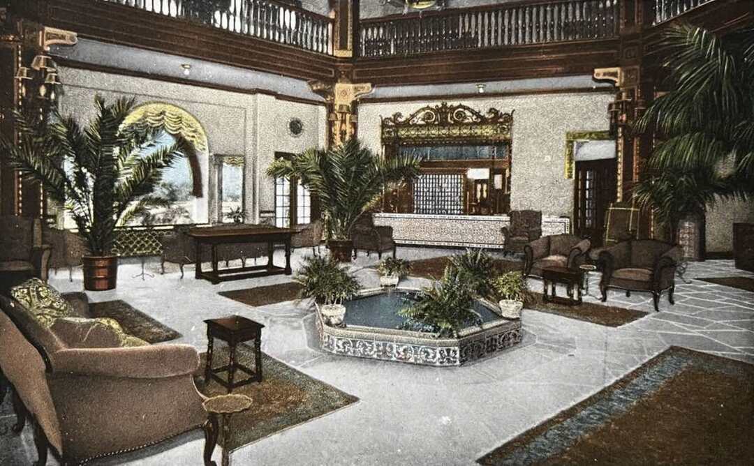 The Alcazar Hotel was built in the Spanish-Moorish style in 1923 and mimicked the architecture of two hotels in St. Augustine, Florida. The Alcazar (which translates as "home in a fortress") is built in the shape of an irregular pentagon, and features a central courtyard which centers on a circular fountain that is a replica of the one at the Hotel Ponce de Leon in St. Augustine. Its stunning interior features a goldfish pond surrounded by a large hexagonal lounge adorned with colorful mosaic tiles. Cleveland architect Harry T. Jeffrey designed the hotel, which took nearly two years to construct at and cost over $2 million.
