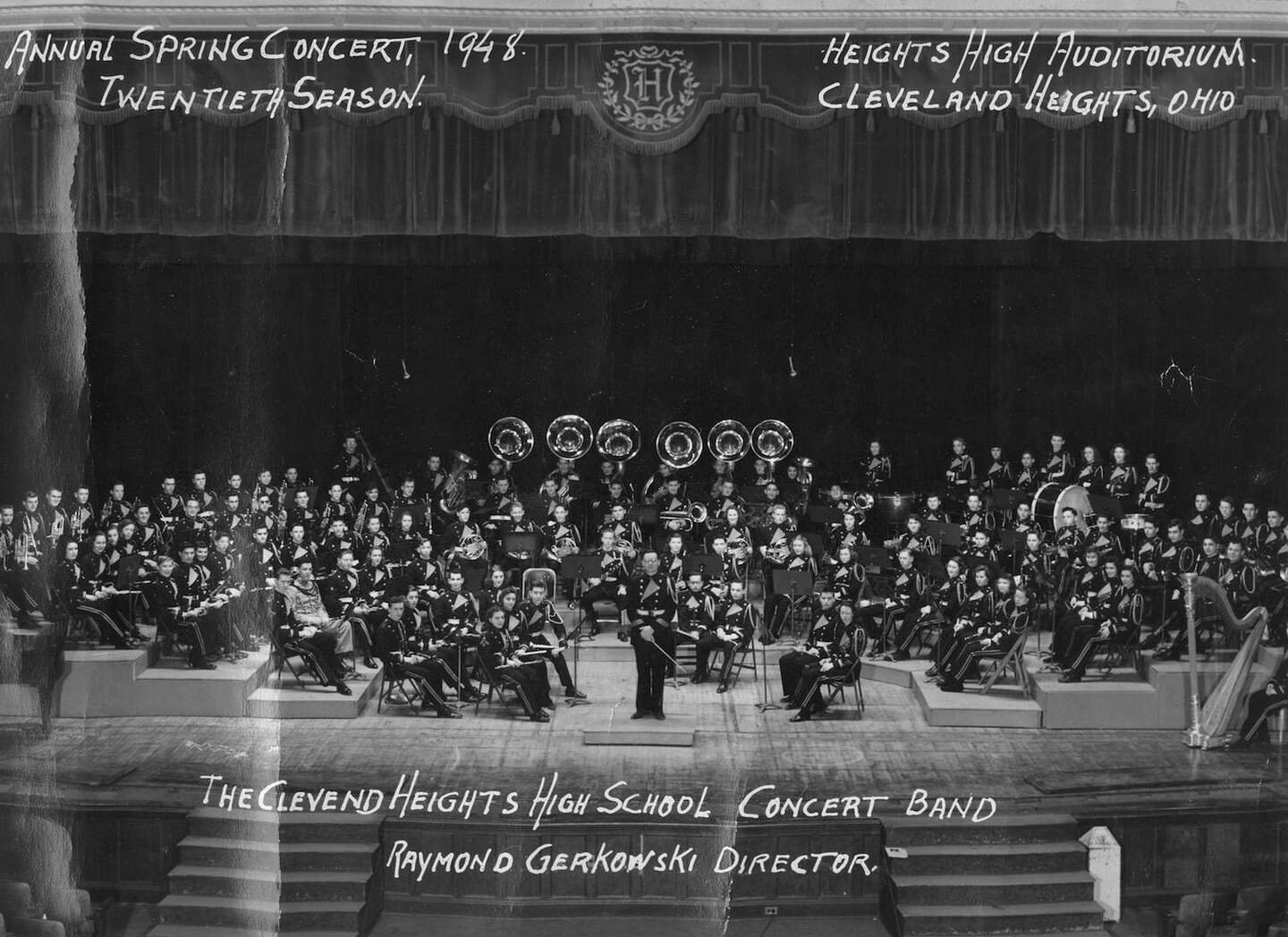 The current Cleveland Heights High School at Cedar and Lee Roads was constructed in 1926, with the previous school rechristened Roosevelt Junior High. The new "Heights" was built to resemble a Tudor castle, featuring a clock tower and high columns that framed a grand main entrance. Architects and school officials tried to make sure that the new school would be large enough to accommodate the ever-growing district's needs. Indeed, a headline from a few months before the school's opening declared, "New Heights High Dwarfs Old One." The same article commented on the school's "mammoth stage" and marveled at the fact that "wires for a radio have been put in every room with a central apparatus in the office to relay outside programs." When it opened, the school was called "one of the most beautiful and commodious school edifices in Greater Cleveland."