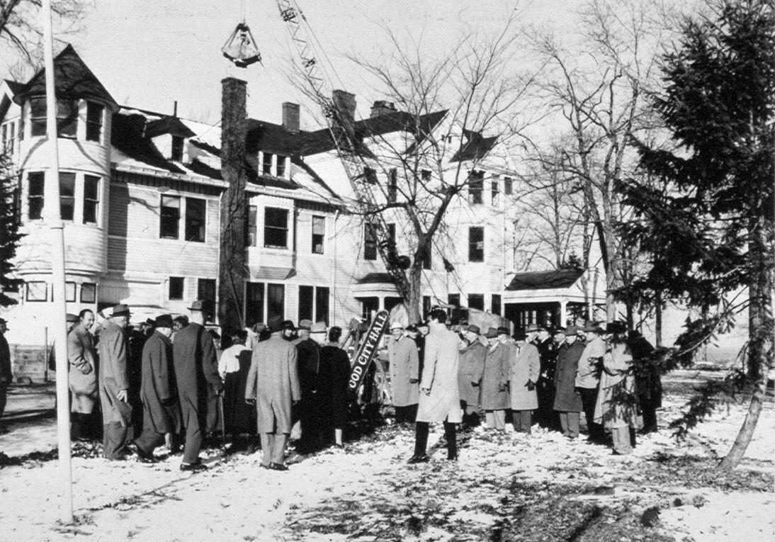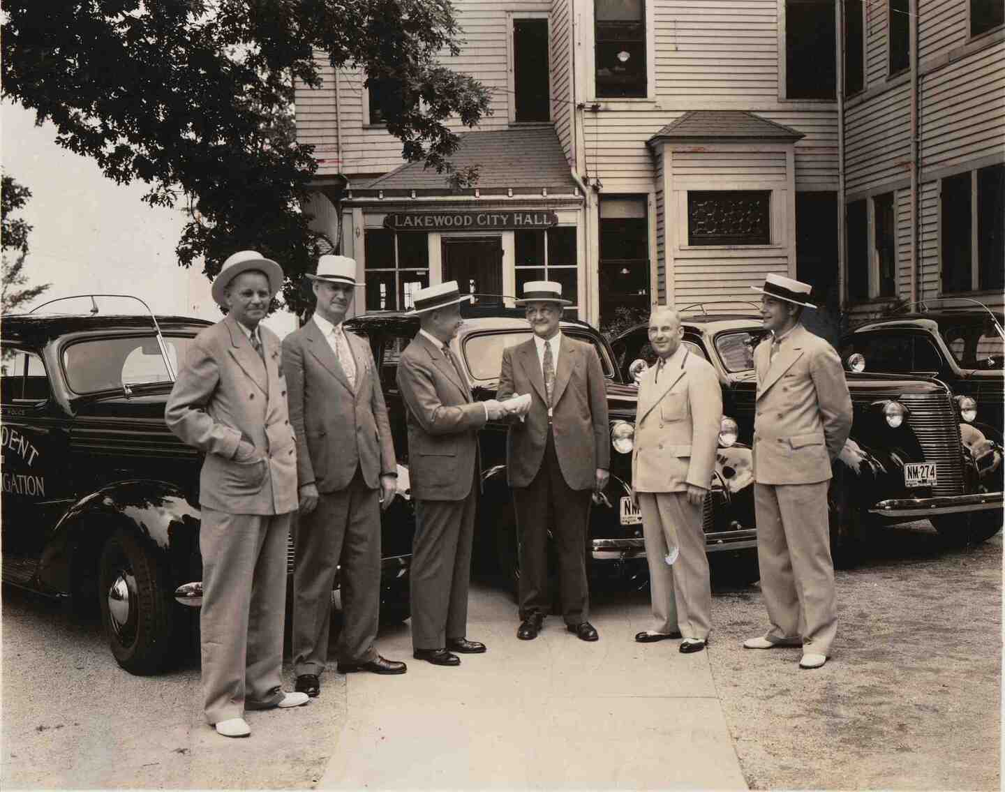 The land that became Lakewood Park previously belonged to Robert R. Rhodes (1845-1916), a wealthy Cleveland industrialist active in the coal, railroad, and banking industries. Daniel P. Rhodes (1813-1875), Robert's father and an early developer of Cleveland's coal mining industry, began buying land in Lakewood (then Rockport Township) in the late 1860s. After Daniel died in 1875, Robert continued to add to his father's Lakewood land holdings and built a summer house on the family's lakefront property in 1881. Rhodes and his family eventually moved into this house, known as "The Hickories," on a full-time basis in 1890, vacating their residence on Ohio City's ritzy Franklin Boulevard. After Robert's death, this house would serve as a convalescent home for wounded World War I soldiers and a temporary hospital during the 1918 influenza pandemic before becoming home to Lakewood City Hall in 1920. The location of the city hall inside a former mansion created some interesting situations. The finance director, for instance, had his office inside a re-purposed bathroom (the fixtures had been removed), while the Lakewood Water Department set up shop in the dining room. The Rhodes house was demolished in 1959 after City Hall moved to a new location.