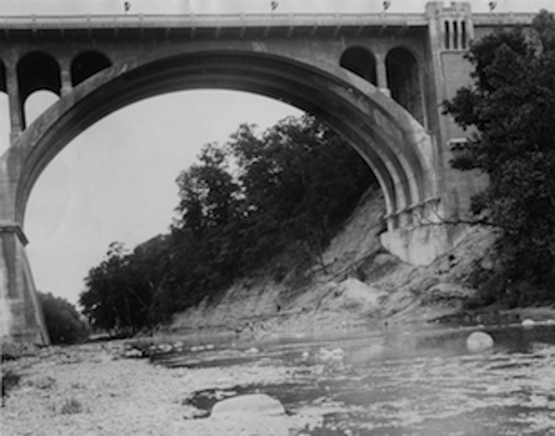 The Hilliard Road Bridge was not the first bridge on this spot. The earliest incarnation of the bridge was known as the "Swinging Bridge," and consisted of a rope bridge with wooden planks that was used by school children and Lakewood residents to cross the Rocky River. It hung thirty feet above the water and was located at the end of Detroit Avenue in what is now the Rocky River Reservation. It remained in place until the 1910s.