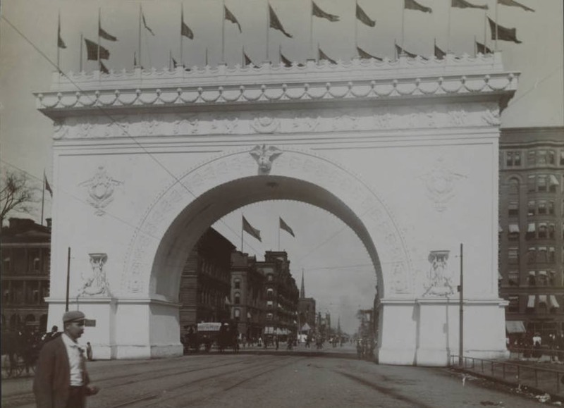 Cleveland Centennial Arch Once again using Public Square as a public memory site, the city erected this large arch over Superior Avenue astride the northeast and southeast quadrants as part of the 1896 centennial of Cleveland's founding. The centennial commemoration also included a replica of an original log cabin on the northeast quadrant across from the Society for Savings Building. Source: Cleveland Memory Project, Cleveland State University Library Special Collections Date: 1896