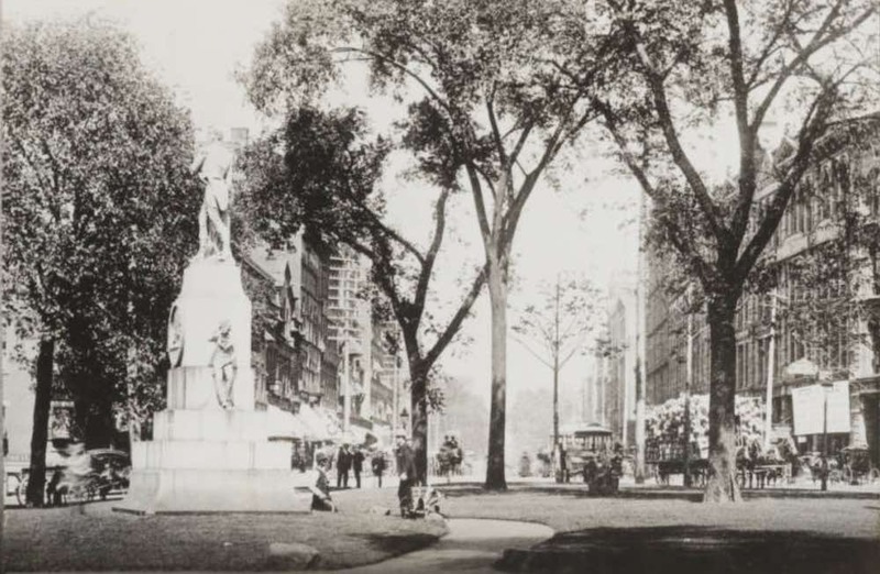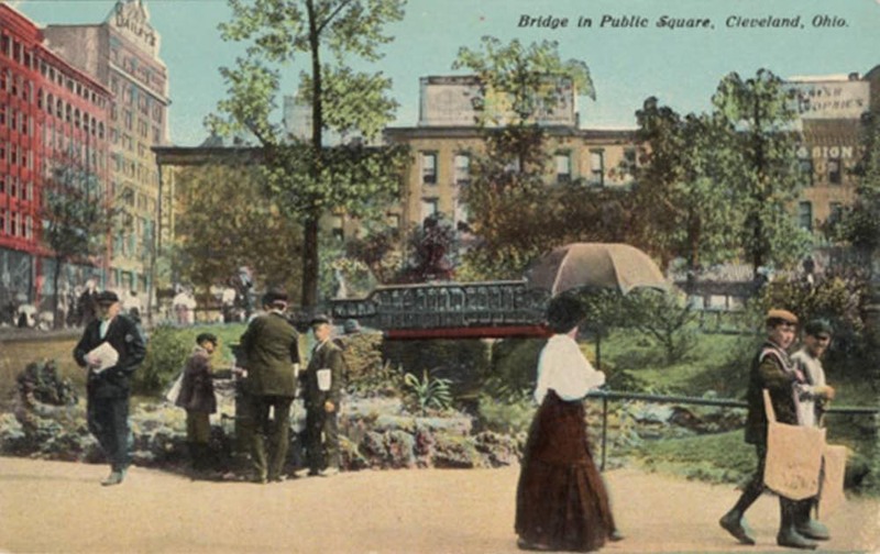 Southwest Quadrant, ca. 1911 This view from the Square's southwest quadrant shows the site of the Terminal Tower nearly 15 years before its construction commenced. For several decades and into the 1920s, Public Square took on a naturalistic appearance that matched the cultivated rambles planned by Frederick Law Olmsted and other like-minded landscape architects in the latter half of the 19th century. The southwest quadrant of Public Square included a rustic bridge traversing an artificial stream flanked by lush plantings. Source: Cleveland Memory Project, Cleveland State University Library Special Collections Creator: Braun Post Card Co. Date: ca. 1911