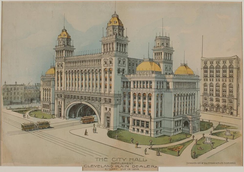 Proposed City Hall Voters approved this Beaux Arts-style City Hall plan, which would have straddled the two northern quadrants of Public Square with a large archway spanning Ontario Street. Following the groundbreaking ceremony in 1895, protestors who deplored building on public land forced the abandonment of the project. Source: Cleveland Public Library Digital Gallery Date: 1895