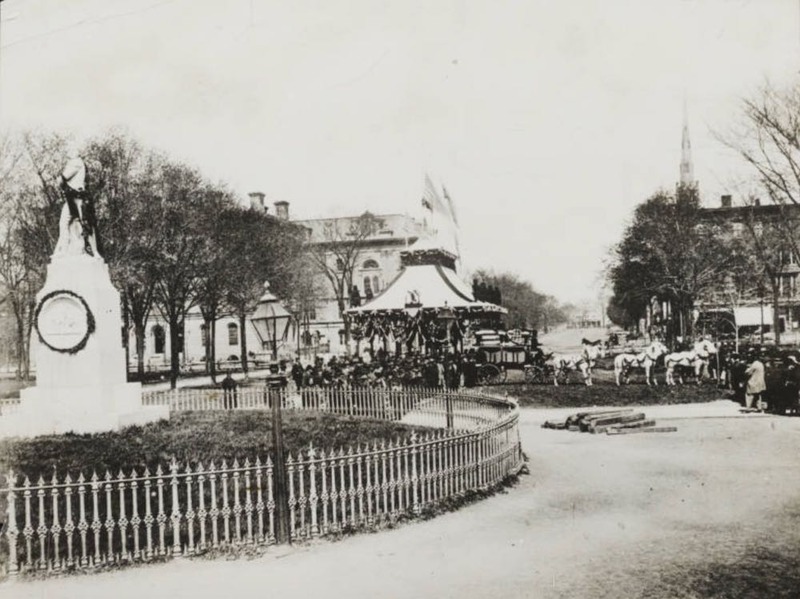 Laid out by Moses Cleaveland's surveying party in 1796 in the tradition of the New England village green, Public Square marked the center of the Connecticut Land Company's plan for Cleveland and, soon, a ceremonial space for the growing city. In 1856, Cleveland's first fountain was constructed on the square. Four years later a statue of Battle of Lake Erie hero Commodore Oliver Hazard Perry was erected in the center of the square, leading City Council to rename Public Square as Monumental Park. In 1865, Clevelanders watched returning Civil War regiments as they mustered on Public Square, and later generations would greet returning veterans from subsequent wars. Public Square also provided a space for viewing the caskets of fallen U.S. Presidents Abraham Lincoln and James A. Garfield in 1865 and 1881, respectively. In perhaps its most notable moment in the 19th century, in 1879, Public Square garnered international attention when inventor Charles F. Brush showcased one of the world's first successful demonstrations of electric streetlights there.