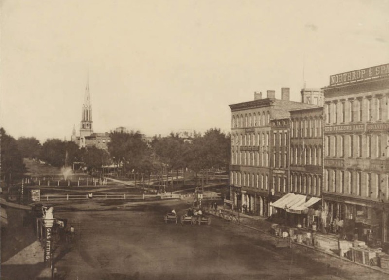 Public Square, Looking East Along Superior In the 1850s the city erected a fence around Public Square to keep out carriage traffic. Ten years after this photo was taken, Superior Avenue and Ontario Street were reopened through the square, where they circled around the centrally located Perry Monument. This photo also shows the first fountain constructed in Cleveland, which occupied in the northeast quadrant. Second Presbyterian Church is visible in the distance (located where 200 Public Square now stands), as is Forest City House (located on the western edge of Public Square where the Renaissance Hotel now stands). Source: Cleveland Public Library Digital Gallery Date: 1857
