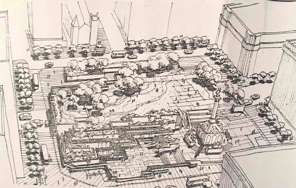 In 1943 a new transit plan called for a new central subway station under Public Square. Ontario Street was to be depressed beneath Superior Avenue, and the Soldiers' and Sailors' Monument was to be relocated elsewhere. A Plain Dealer reporter quipped that the statue's removal "alone is almost worth the cost."  The 1940s and 1950s passed with no action on building a subway system. A 1958 plan proposed by architect Howard B. Cain, whose Park Building offices overlooked Public Square, envisioned closing Ontario, depressing Superior below grade, removing the Soldiers' and Sailors' Monument, and creating a Rockefeller Plaza-influenced sunken plaza with an ice-skating rink. Dubbed International Square, Cain's transformation--no doubt inspired by the expanded world trade that boosters claimed the impending opening of the St. Lawrence Seaway would produce-imagined shops and restaurants representing many nations. The next year, a new downtown master plan revived the idea of a subway under Public Square, this time affecting only its southern half. The plan also called for lowering the level of the northern half of the square, moving the Soldiers' and Sailors' Monument to the northeastern quadrant and building a sunken ice rink in the northwestern quadrant.  Like Cain's plan, this part of the downtown plan languished when county commissioners nixed the subway project. In the wake of the subway defeat, a 1960 plan to close through streets in Public Square and construct a 1,600-car underground garage likewise failed.