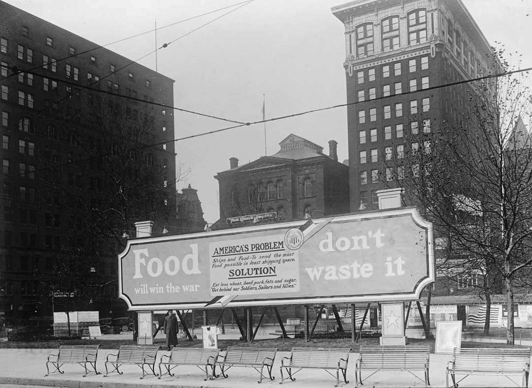 Food Administration Sign This Food Administration sign stood on the north side of Superior Avenue in the northwest quadrant of Public Square after the U.S.'s entry into World War I. Pictured behind the sign are (left to right): American Trust Building, Cuyahoga County Courthouse, and Illuminating Company Building. The sign reads: "Food will win the war - don't waste it" and "America's Problem: Ships and Food - To send the most Food possible in least shipping space. Solution: Eat less wheat, beef, pork, fats and sugar. Get behind our Soldiers, Sailors and Allies." Public Square was an ideal location for such a sign because of its central location. Source: Library of Congress Prints and Photographs Division Creator: National Photo Company Date: ca. 1918