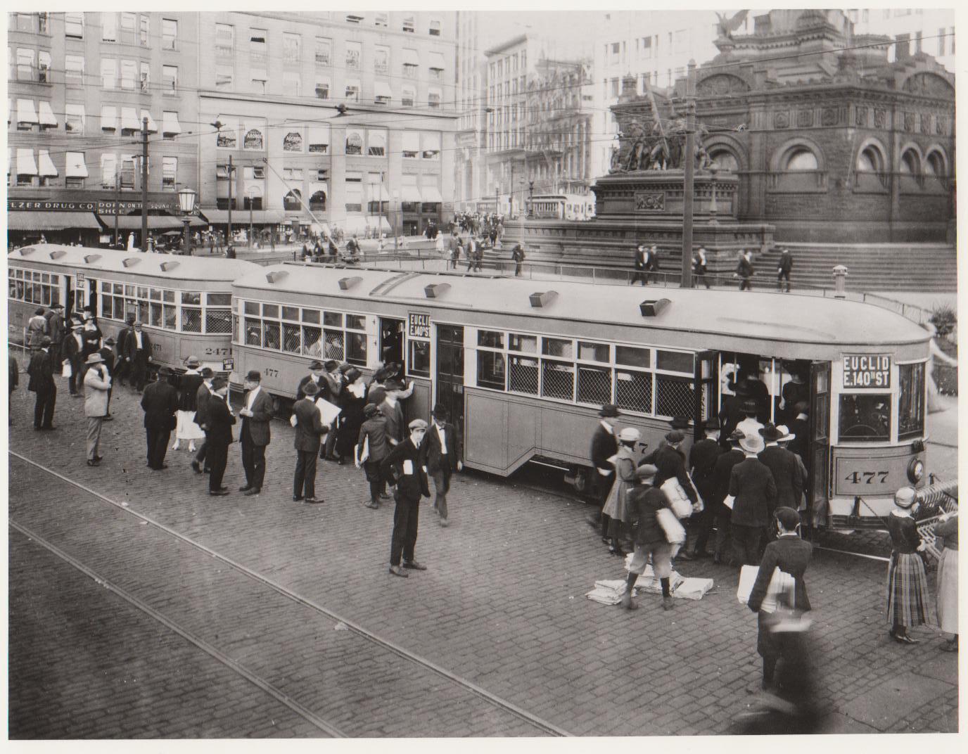 Interurban Railcar, 1920 Passengers board an interurban railcar near the southeast quadrant of Public Square in 1920. Public Square was solidly focused on public transportation by this time, with local streetcars and longer-distance interurban lines converging here. Source: Western Reserve Historical Society Date: 1920