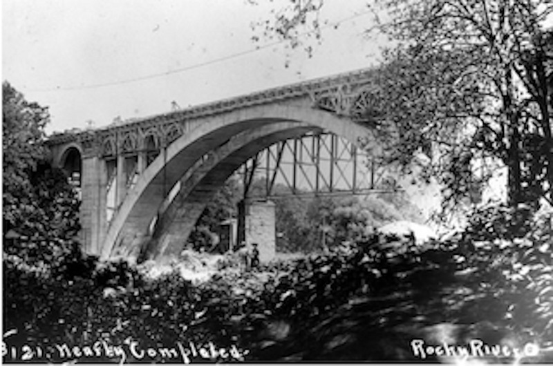 Completed Arch Looking north from the Rocky River Valley at the Detroit–Rocky River Bridge. The bottom portion of the Rocky River Viaduct can be seen behind the bridge. The 700-foot concrete span bridge was designed by Wilbur Watson and built by the Schillinger Brothers Construction Co. in 1910. Source: Michael Schwartz Library Special Collections at Cleveland State University Date: 1910