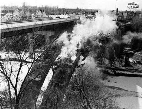 Demolition of 1910 Bridge The 1910 bridge was demolished in 1981 with dynamite. The new bridge is on the left. Source: Michael Schwartz Library Special Collections at Cleveland State University Date: 1981