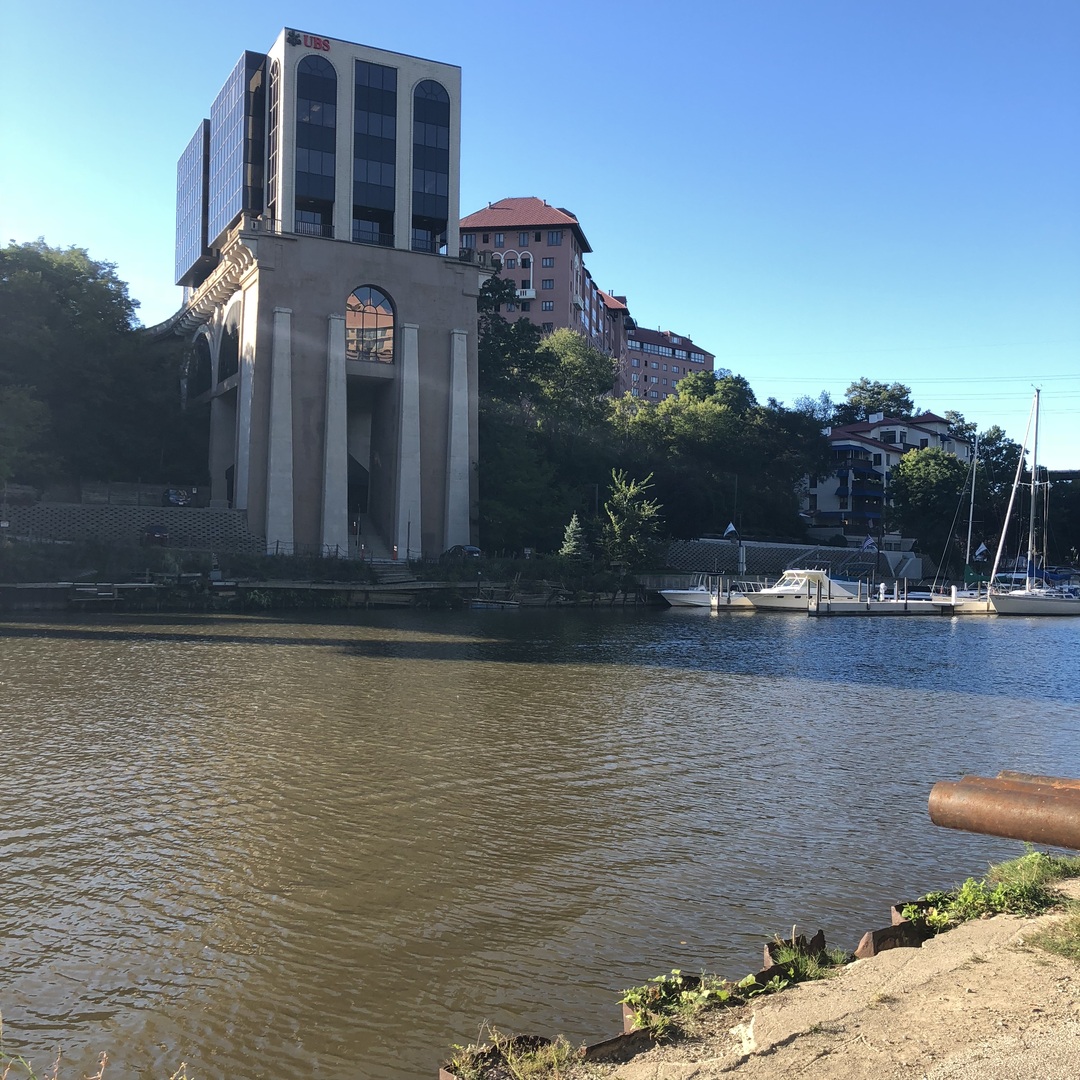 Bridge Building, viewed from Rocky River Marina The Bridge Building at 18500 Lake Road incorporates the western stub of the 1910 Detroit–Rocky River Bridge into its architectural foundation. The building was a collaboration between architect John Rozukalns and engineer Robert A. Hillenbrand of the Seuffert Construction Company. Creator: Erin Bell Date: 2018
