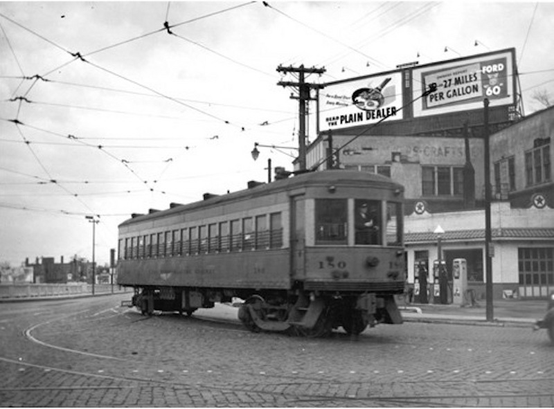 LSE Interurban Car This streetcar, run by the Lake Shore Electric Interurban Company, just exited the Detroit–Rocky River Bridge (which can be seen in the background on the left). It is turning onto Sloan Avenue in Lakewood. The interurbans necessitated the building of the 1910 bridge. The billboard on the left reads "Read the Plain Dealer." The billboard of the right for Ford Motor Co. reads "Owners Report 22 to 27 Miles Per Gallon." Note the electrical wires overhead. Source: Michael Schwartz Library Special Collections at Cleveland State University Date: 1938