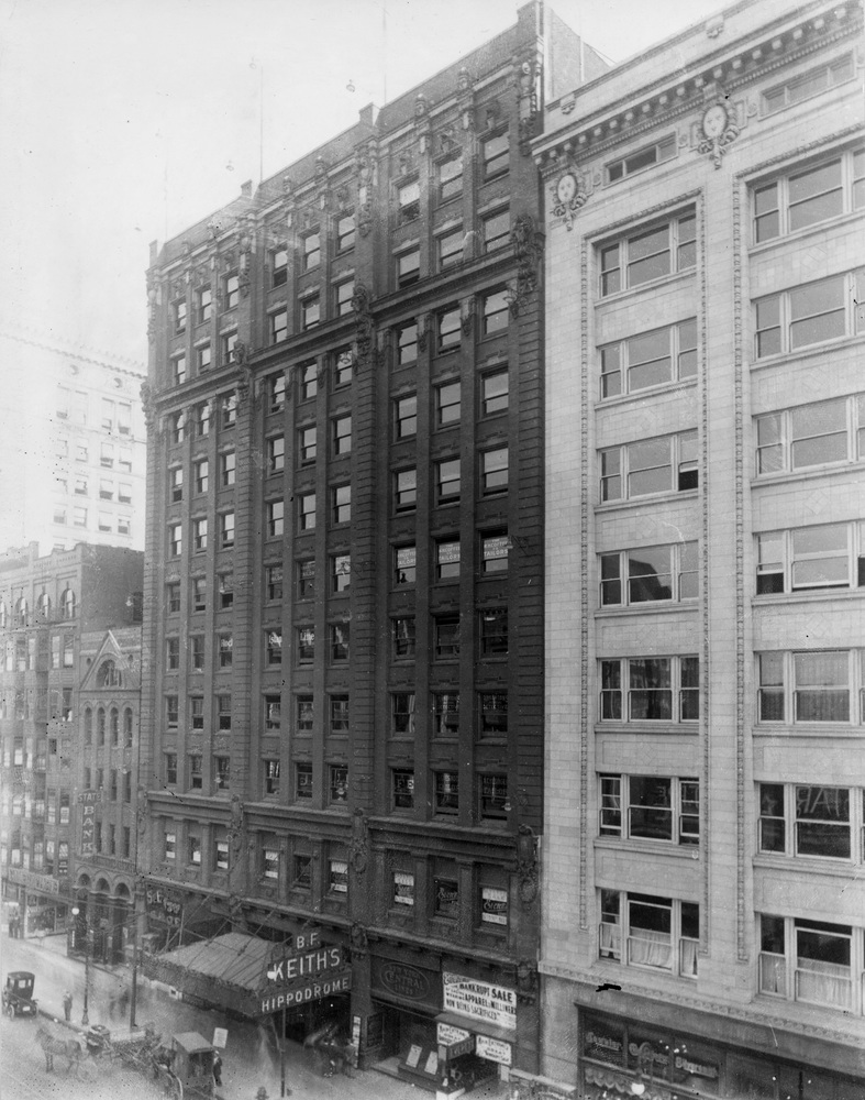 Eighteen months of planning and preparation preceded the opening of the massive Hippodrome Theater on December 31, 1907, with seating for 3,548 and the world's second largest stage. Architect John Eliot of Knox and Eliot designed the building to span the lot at 720 Euclid Avenue through to Prospect Avenue to the south. Ensconced in an eleven-story office building with theatre marquees and entrances on both streets, “The Hipp” was originally designed to host operas, plays, and vaudeville shows and prospered for two decades with a variety of live theater events. It hosted performances by the most famous performers of the early twentieth century, including Enrico Caruso, W. C. Fields, Will Rogers, Lillian Russel, John Phillip Sousa, and Al Jolson.
