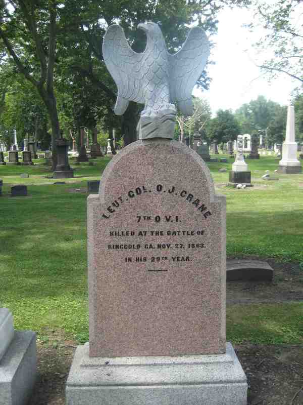 Crane's Grave Lieutenant Colonel Orrin J. Crane died at the battle of Ringgold while trying to attend to Colonel William R. Creighton's gun shot wound. Creighton also died that day. The two men are buried side by side at Cleveland's Woodland Cemetery. Image courtesy of Diane Norris