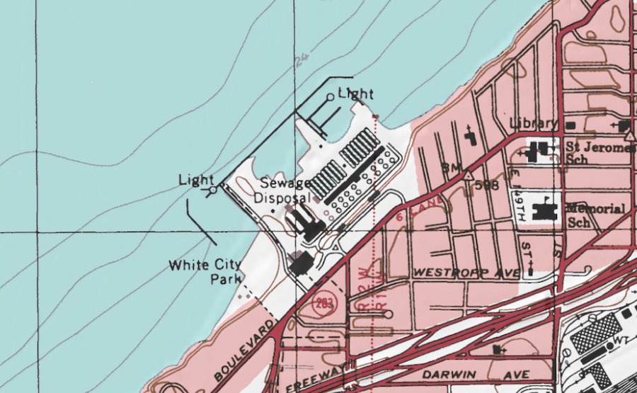 During the 1970s the area that now occupies the western edge of Cleveland’s Easterly Wastewater Treatment Plant was still known as White City Park. The tract of land bordered by Bratenahl Village to the west and the city sewer authority property to the east existed as a public park in various incarnations since 1900. Lake Shore Boulevard bounded its entrance to the south at East 140th Street in Collinwood Village (later annexed by Cleveland). The park's lakeshore was attractive to swimmers, fishermen, and boaters for the rest of the 20th century. White City Park has shared several names and faces over the past century.