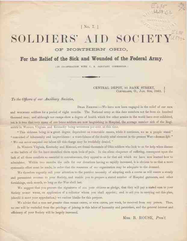 Guide For Seeking Donations, 1862 This is a letter sent from the Soldiers' Aid Society of Northern Ohio in Cleveland dated January 8, 1862. It is addressed to the officers of their Auxiliary Societies and tells them how they might successfully seek donations from citizens in their area. As Rouse states, "...thus no will be excluded from the privilege of joining this labor of humanity and patriotism, and the general interest and efficiency of your Society will be largely increased." Source: Western Reserve Historical Society Date: 1862