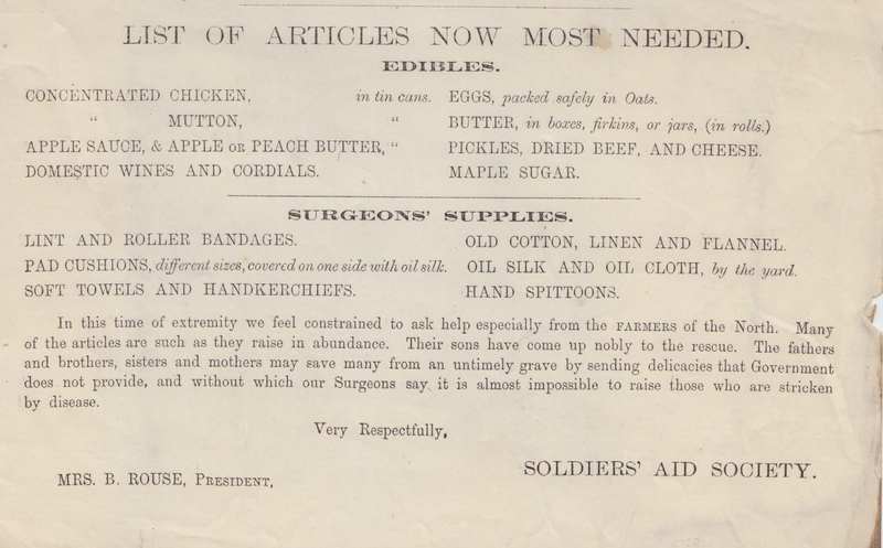 "Articles Now Most Needed" The Office of the Soldiers' Aid Society of Northern Ohio sent this document (dated April 2, 1862) and many others of its kind to their auxiliaries asking for supplies. What kinds of supplies is Rebecca Rouse, president of the Aid Society, asking for? Who is she asking to supply them? You can sense the urgency with which she writes as she states, "The fathers and brothers, sisters and mothers may save many from an untimely grave by sending delicacies that Government does not provide, and without which our Surgeons say it is almost impossible to raise those who are stricken by disease." Source: Western Reserve Historical Society