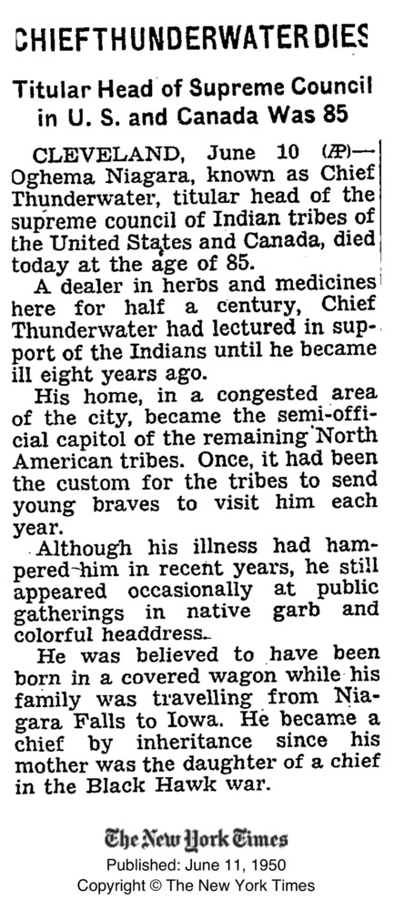 Oghema Niagara of the band Pishqua, tribe Osauckee of the Algonquin nation, was born amid the thunderous sound of the Niagara on September 10, 1865, in the Hut of Two Kettle on the Tuscarora Indian Village in Lewistown, New York. Cleveland became his home during the first decade of the 20th century. He came to be known among white men as Chief Thunderwater and built an impressive career as a business leader and civic booster while maintaining his native identity.