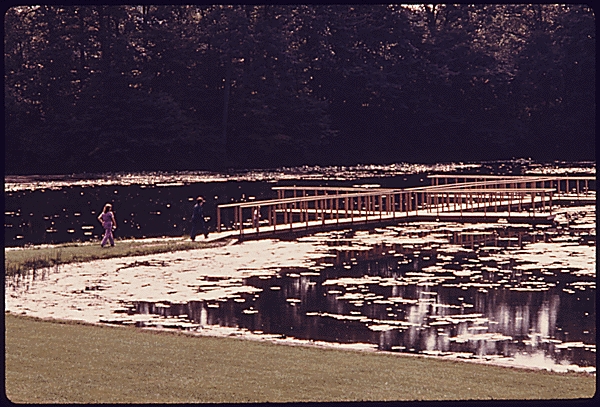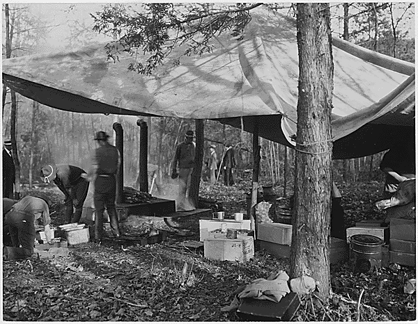 In the 1930s, the Civilian Conservation Corps (CCC) built shelters and trails as a part of the New Deal's public works programs. Young men ages 18-25, who were jobless due to the Great Depression, were recruited to cut locally quarried sandstones to build steps among the natural rock outcroppings. CCC workers also built shelters from wormy chestnut trees found in local forests. The Happy Days lodge they built there was named after the song, "Happy Days are Here Again," featured prominently in Franklin Roosevelt's 1932 Presidential campaign. The unique shape of the octagon shelter is a good example of how architects incorporated their designs into the natural landscape.