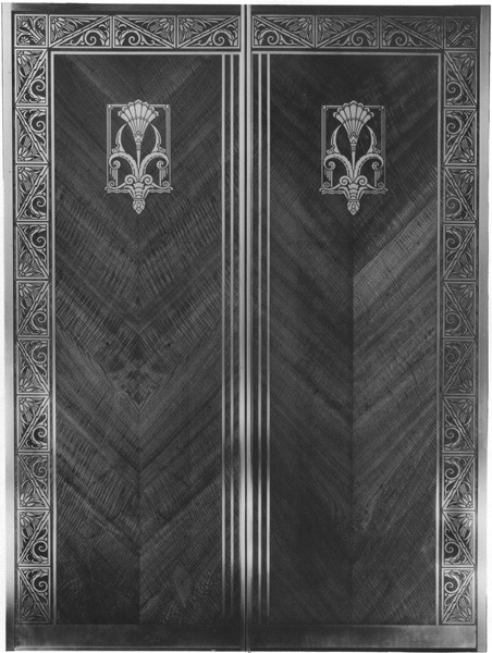 Elevator doors made by W.S. Tyler Co. for the Higbee Co. These elevator doors from 1931 were made for the Higbee Co. and resembled the style the Tyler Company used when making doors for ocean liners around the world. Image courtesy of Cleveland State University, Michael Schwartz Library, Special Collections