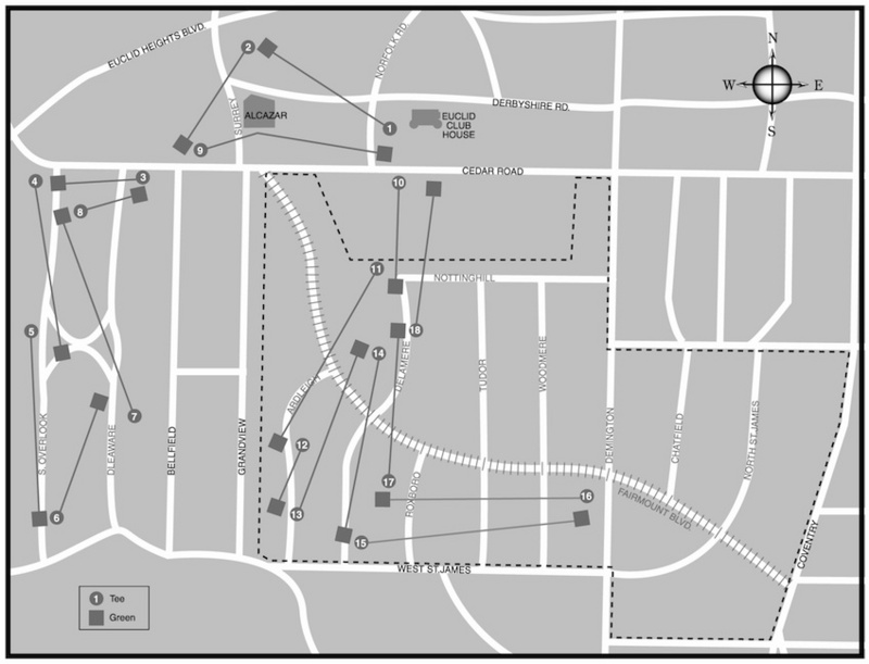 Golf Links A map of the Euclid Club grounds appeared in the Plain Dealer when the club opened.   A current street map is superimposed to show the approximate location of the 18 holes.   Golfers teed off at the club house, crossed Cedar, and returned to the clubhouse to finish nine.   The tenth through eighteenth holes were across Cedar on the grounds that would be come the Euclid Golf Allotment.   Thanks to William Barrow for sourcing the original links layout.   Image courtesy of Hugh Fisher and Deanna Bremer Fisher