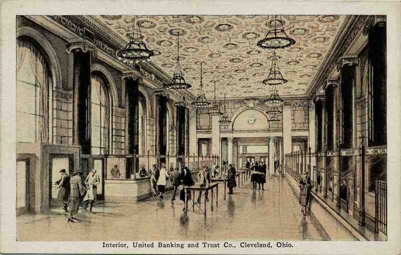 United Bank Lobby The United Bank Building's street-level banking room, where the public came to conduct transactions, is pictured here. Its lavishness was meant to instill the customers with confidence in the bank. Image courtesy of Cleveland State Library Special Collections