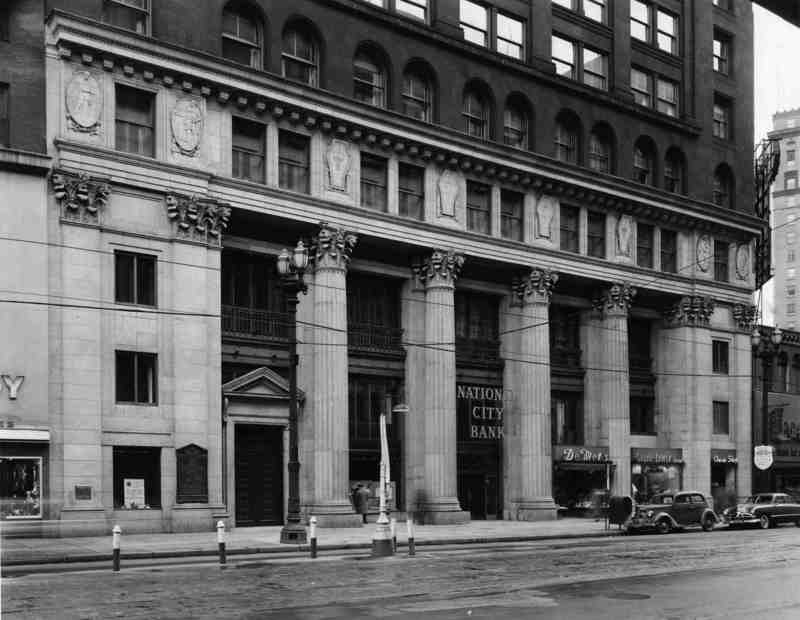 National City Bank, 1950 Walker and Weeks added this classical facade when they remodeled the Guardian Savings and Trust Building (originally built in 1895, it later became known as the National City Bank Building) at 629 Euclid Avenue in 1915. The firm designed a colonnade of four three-story high Corinthian columns to frame the building's entrance. Image courtesy of Cleveland State Library Special Collections