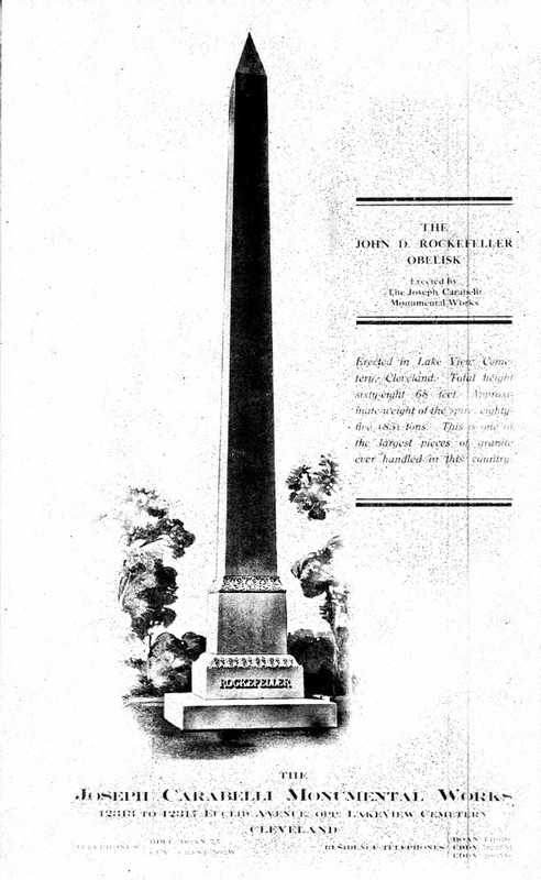 Monument by Carabelli In 1914, Cleveland's famed monument makers proudly advertised that they had erected one of the largest granite obelisks ever in the United States for the Rockefeller family. The monument was placed at Lake View Cemetery in 1899. Creator: The Joseph Carabelli Monument Works