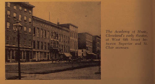 The Academy of Music on Bank (now W. 6th) Street was one of the top American theaters of its time. Theater doors were opened for the first time on April 16, 1853 for the production of School for Scandal. The early days proved challenging, and two years later the theater was leased by John A. Ellsler to save it from financial ruin. It was under his rule that the theater had its heyday. "Uncle John" Ellsler started his stock company, one of the first American dramatic schools, at the Academy. It proved a great success. With the exception of some relatively brief absences, Ellsler's stock company provided Clevelanders with Shakespearean and popular entertainment for three decades. After the stock company system started to die, however, larger theater houses were built. Consequently, Cleveland's entertainment center shifted away from Bank Street and Ellsler decided to discontinue his lease for good. The Academy was then left in the hands of numerous managers, none of whom were able to regenerate the theater's previous success.