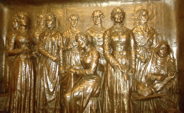 Soldiers Aid Society This relief statue shows the Sanitary Commission, the Soldiers' Aid society and the hospital service. The women shown include Mrs. Benjamin Rouse, Miss Mary Clarke Brayton, Miss Ellen F. Terry, Miss Sara Mahan, Mrs. John Shelly, Mrs. William Melhinch and Mrs. J. A. Harris. The hospital work is represented by Mrs. R. B. Hayes, Mrs. Peter Thatcher are busy with hospital work alongside a Sister of Charity who is tending to a wounded soldier. Creator: Heidi Kathleen Elise Fearing
