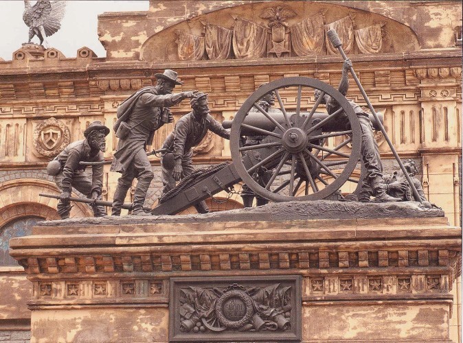 The Color Guard "The Color Guard" is a representation of the Infantry group. Depicted here is the One Hundred and Third Ohio infantry at the Battle of Resaca that took place May 13-15, 1864. Sergeant Martin Striebler and his eight corporals defended the flag until each of them were killed or wounded. The monument's architect, Levi T. Scofield was one of the infantrymen who fought at this battle. Creator: C. W. Perron