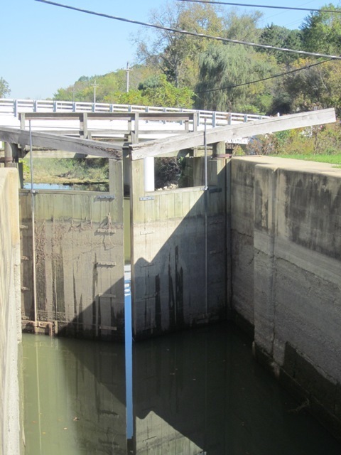 Lock 38 Today The Ohio & Erie Canal consisted of 44 stair-step locks that carried canal boats uphill and downhill. When traveling from Lake Erie to Akron's summit, canal boats moved up in elevation by 395 feet. These lock gates closed on either side of the canal boat before water was pumped in or drained out to raise or lower the boat. Creator: Carolyn Conklin