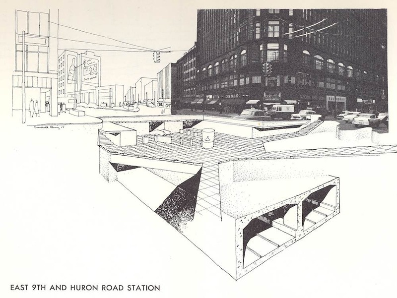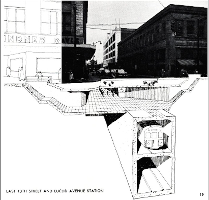 In this cutaway illustration of proposed downtown subway station looking north on East 13th Street from Euclid Avenue, the Sterling Lindner Davis department store is visible to the left. Cowell & Hubbard stands to the right with the Middough Building to its rear. The subway, according to the primary planned loop route, would have run beneath present-day Star Plaza in Playhouse Square. A later variant in the 1959 plan would have placed the Playhouse Square station one block east outside the Hanna Building at Euclid and East 14th. Source: Praeger-Cutting-DeLeuw, Cleveland Subway: Operating and Feasibility (Cleveland, 1955)