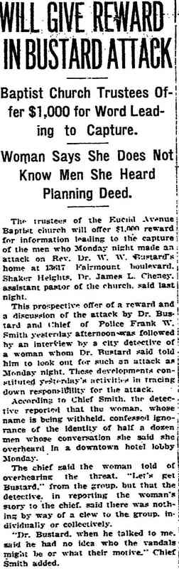 In 1919, the Jacob Strong home was sold to William W. Bustard. Bustard was a fiery and controversial Baptist minister who served as pastor of the Euclid Avenue Baptist Church in Cleveland from 1909 to 1925. Upon purchasing the Jacob Strong home, Bustard commissioned the well-known Cleveland architectural firm of Walker and Weeks to make additions and changes to the house to convert it from Western Reserve Greek Revival style to Colonial Revival style. In 1921, shortly after Walker and Weeks completed their work, the house was the site of an attempted attack upon Reverend Bustard. In the evening hours of November 28, 1921, five armed gunmen cut the telephone wires to the house and assaulted an employee of the Church who lived with the Bustard family. Rev. Bustard was not at home at the time. While no one was ever arrested or charged in connection with this attack, which also involved a gun battle between the armed gunmen and Shaker Heights police in the middle of the night, many at the time suspected that the attack was in response to Bustard's fiery condemnation of former Cleveland Police Chief Fred Kohler who had recently been elected Mayor of Cleveland.