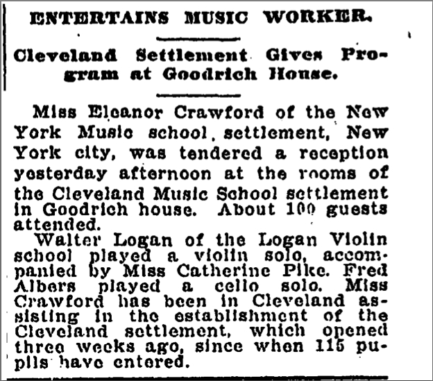 Almeda Adams established the Music Settlement in 1911 inside the walls of the Goodrich House with support from future Cleveland Orchestra founder Adella Prentiss Hughes. Although blind, Adams mastered and taught music with the help of colleagues and a $1,000 donation from the Fortnightly Musical Club. The settlement house provided free or inexpensive musical training for the Cleveland's immigrant population, especially children. Within a few years, attendance more than tripled and the school was forced to move several times to accommodate growing class sizes. During the Depression, class fees were waived for most students. In 1938 Edmund Burke, a wealthy banker, sold his forty-two room house to the Cleveland Music School Settlement. The Music Settlement still resides in the Burke Estate at 11125 Magnolia Drive although the campus now encompasses five buildings.