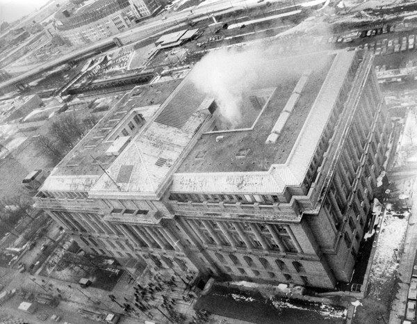 City Hall on Fire On Tuesday, March 9, 1982, a fire began on the fourth floor of Cleveland's City Hall. The room in which the fire started—and luckily was contained—was filled only with city financial and bond records. The fire caused $100,000 worth of damage. The blaze was the result of a damaged extension cord leading to a coffee maker. Source: Cleveland Memory Project, Cleveland State University Library Special Collections