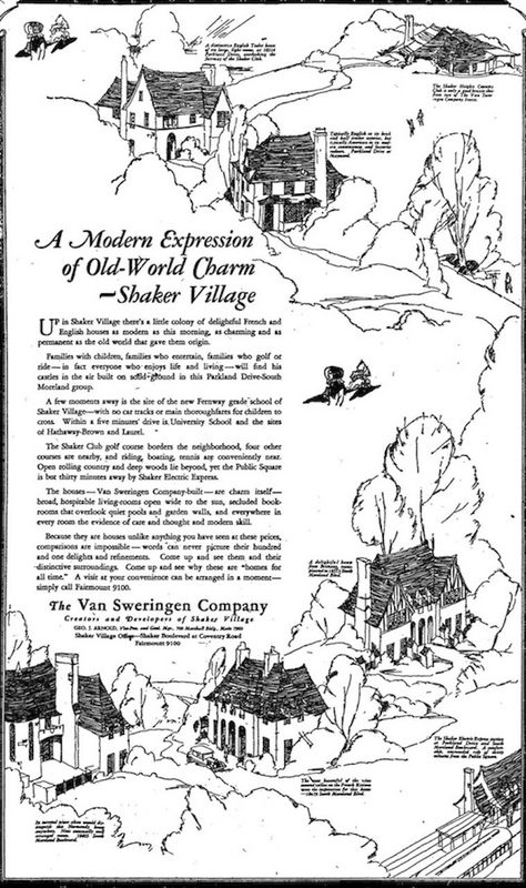 Both small and large groupings of demonstration homes were constructed on Parkland Drive, Moreland Boulevard (now Van Aken), Courtland Boulevard, and South Woodland in the early 1920s. Reflecting the guidelines presented to prospective clients by the Van Sweringen Co. in "Shaker Village Standards", the structures were to define the character of the residential neighborhoods and promote the sale of surrounding lots. As prescribed by the Van Sweringens for all Shaker residences, the demonstration homes were designed by prominent architects such as Phillip Small, Howell & Thomas, and Bloodgood Tuttle.