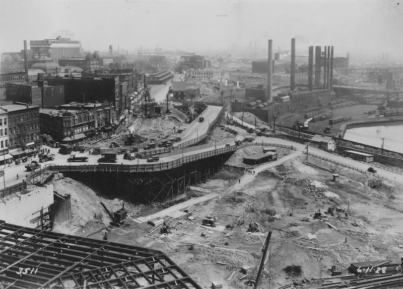 By 1916, the brothers had acquired the right of way from Shaker Village to Cleveland and construction for the Cleveland Interurban Railroad began. Delayed by World War I, the transit system would not be completed for six years. Upon its opening, transportation time from the suburb to the urban center was cut by more than half. From Moreland Circle, later known as Shaker Square, the estimated travel time to the downtown was 20 minutes. From the Lynnfield Station, the trip would take a half hour. The impact of the electric train on Shaker Village was profound and immediate. Between 1919 and 1929, the population of Shaker Heights grew from 1,700 to 15,500, property value increased from less than a million dollars to over $80 million, and nearly 3,000 new homes were constructed. The success of this rapid transit system in promoting the development of Shaker Heights would also spur the construction of Cleveland's most defining building, the Terminal Tower.