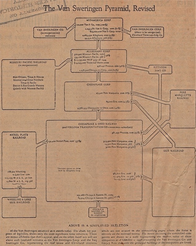 Van Sweringen Holdings The Van Sweringen brothers set up an intricate system of holding companies to manage their real estate and railroad ventures. These corporations held controlling stock of the various companies, which were funded by outside investors. The individuals putting up money to fund the companies were regularly paid dividends, but had no authority to vote on business decisions. Such a setup ensured that the Vans maintained complete control over the development of their businesses, while limiting the investment of their own capital for startup and operating costs. Source: Shaker Historical Society