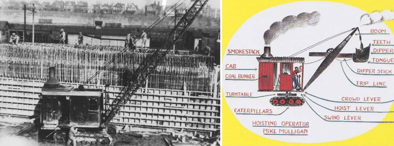 Kinsman Tunnel Construction Mike Mulligan and His Steam Shovel was a popular children's book first published in 1939. Pictured is a similar steam shovel digging a tunnel for the rapid transit and railroad lines near East 55th Street and Kinsman Road. Excavated materials from the construction of tunnels were often hauled to different locations along the railroad and transit lines to be used as fill material for grading operations. Source: Shaker Historical Society / Wikimedia Commons