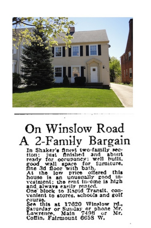 17620 Winslow Road A May 1927 newspaper advertisement for the house at 17620 Winslow Road referred to the street as "Shaker's finest two-family section." The ad also described the house as "an unusually good investment," since its owner could easily rent out half of the duplex. Source: CSU Center for Public History + Digital Humanities