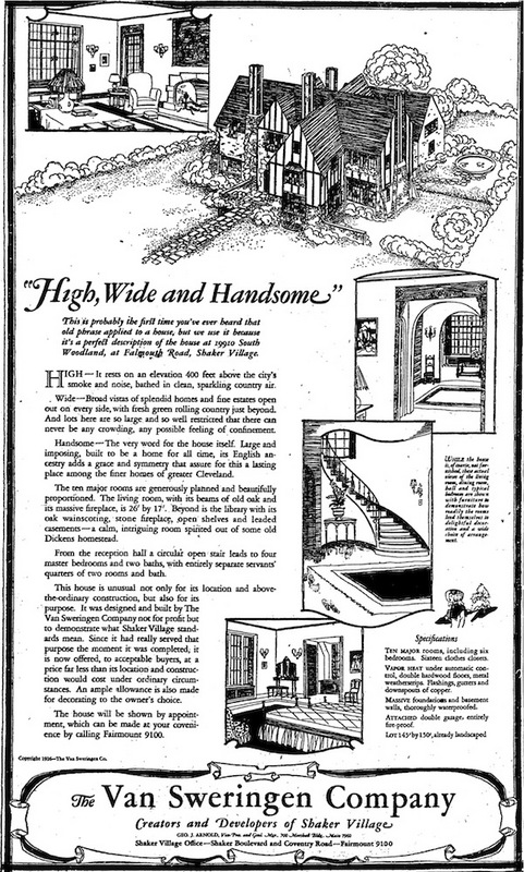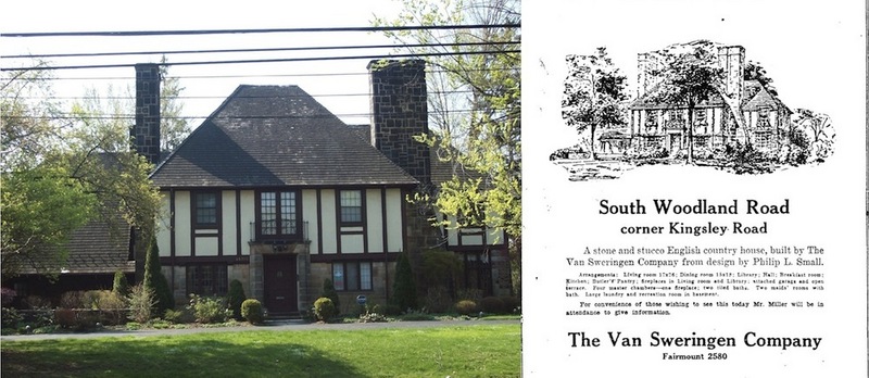 Small's five demonstration homes, built in 1924, lie along South Woodland Boulevard, just west of Warrensville Center Road at (from east to west) 20000 South Woodland, 19910 South Woodland, 19700 South Woodland, and 19600 South Woodland. The fifth is nearby at 3158 Morley Road. All of the houses were designed in various types of English style, are built of brick and stucco with wood shingle roofs, and feature Tudor half-timbering and leaded glass casement windows on their exterior. English architecture was popular during the development of Shaker Heights, and Van Sweringen Company newspaper advertisements from the 1920s favorably compared Shaker's ambience with the "charm of England." A 1926 ad even refers to Small's Demonstration Home at 19910 South Woodland Road as "a true modernization of the famous old country houses of Dickens' England." At this time, the idealized English countryside served as a symbol of peacefulness, beauty, and security to wealthy Clevelanders looking to escape an increasingly chaotic big city. Indeed, as the same 1926 ad asks, why "go to England, thousands of miles away, to visit that charm" when "we can live with it always in Shaker Village, thirty minutes away[?]"