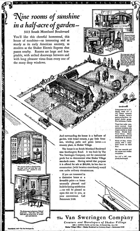 3113 Van Aken Ad, 1926 This Van Sweringen Company newspaper advertisement for the house calls it "as interesting and as sturdy as its early American ancestry, and as modern as the Shaker Electric Express that passes nearby." Source: Cleveland State University Library Special Collections