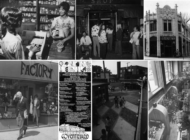 Shopping at Coventry By the 1970s, the Coventry business district was undergoing a drastic change. Service based businesses and shops catering to the community's immigrant populations began to close their doors, and were being replaced by boutique shops that specialized in novelty products. Many of these shops would find a very temporary home in the CoventrYard mini-mall. Between 1960 and 1975, the number of malls in America more than tripled. Source: Clockwise: Cleveland Public Library Photograph Collection (Images 1 and 4), Joe Polevoi (Images 2 and 5), Cleveland State University Library Special Collections (Images 3 and 7), CoventrYard advertisement (Image 6)